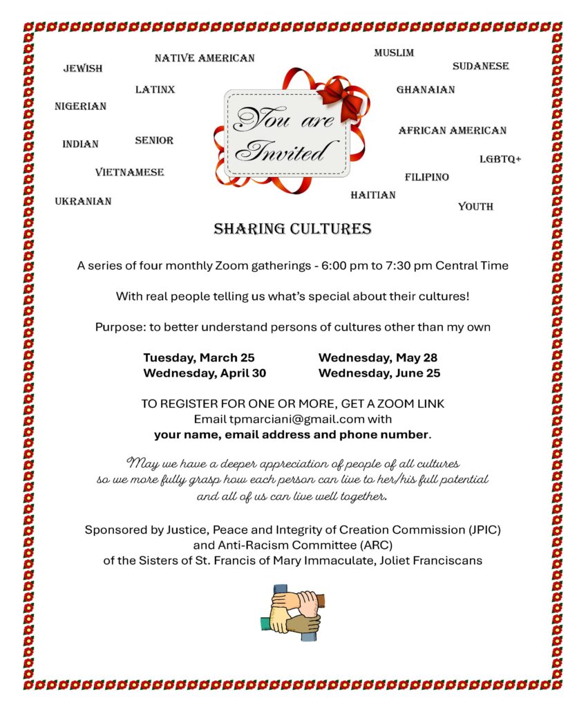 Please Join us for Sharing Cultures Zoom Series Sharing Cultures Flyer 2025 Please register by emailing tpmarciani@gmail.com.